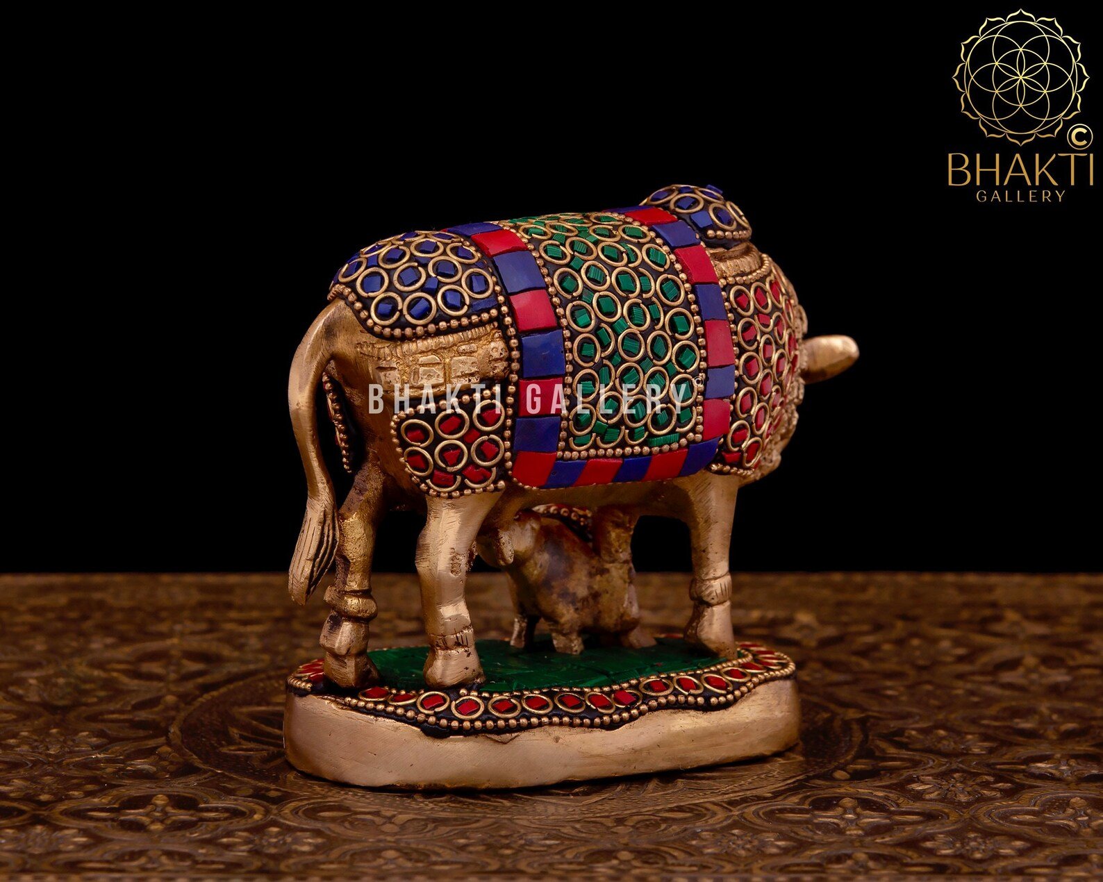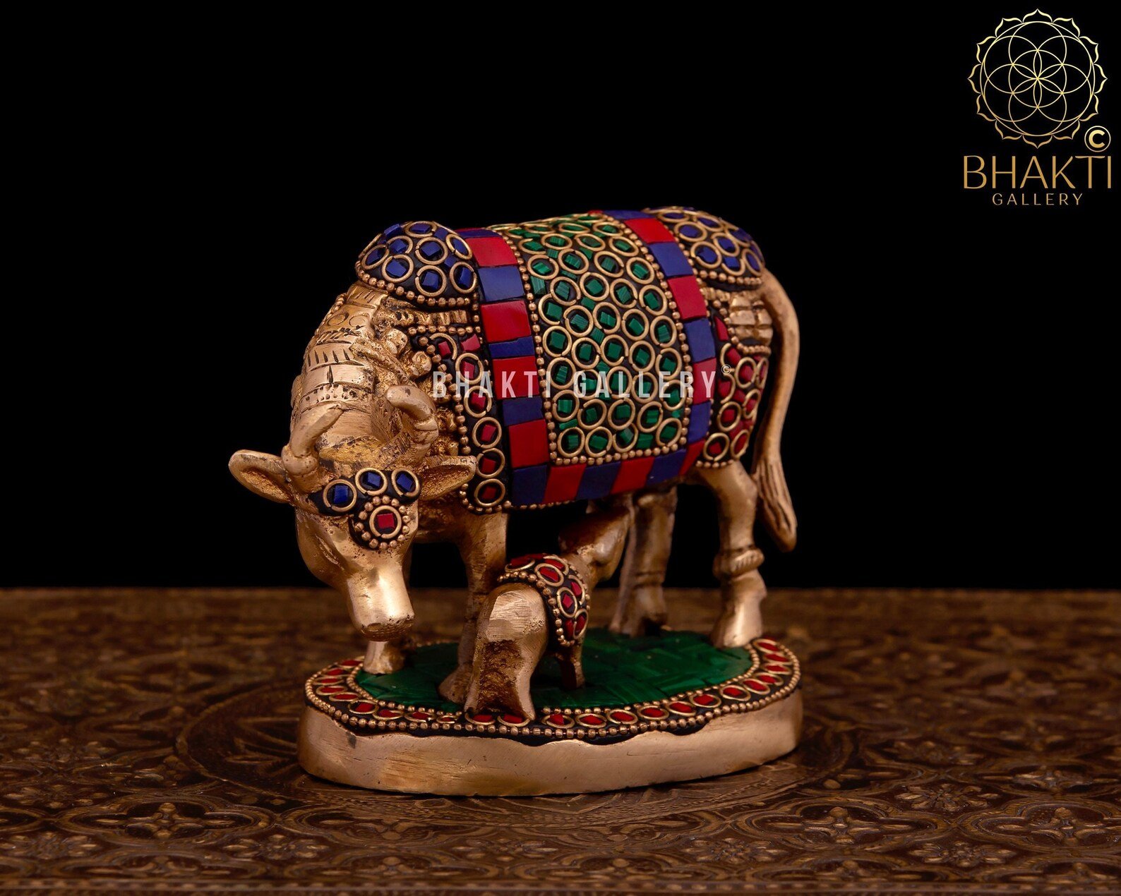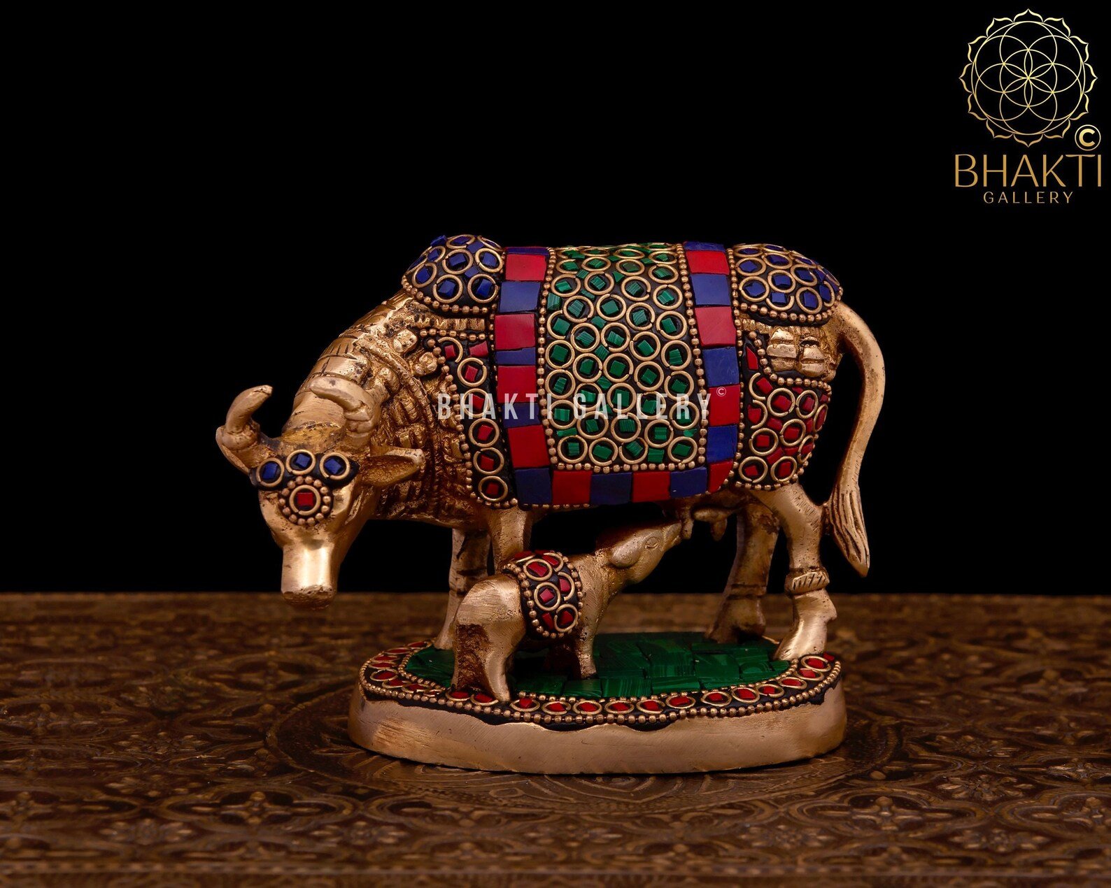 This beautifully handcrafted Brass Kamadhenu Cow & Calf Statue with Stonework represents Kamadhenu, the sacred wish-fulfilling cow, along with her calf—symbolizing abundance, nourishment, care, and prosperity. Designed in a calm and relaxing posture, the statue radiates peace, positivity, and divine grace.