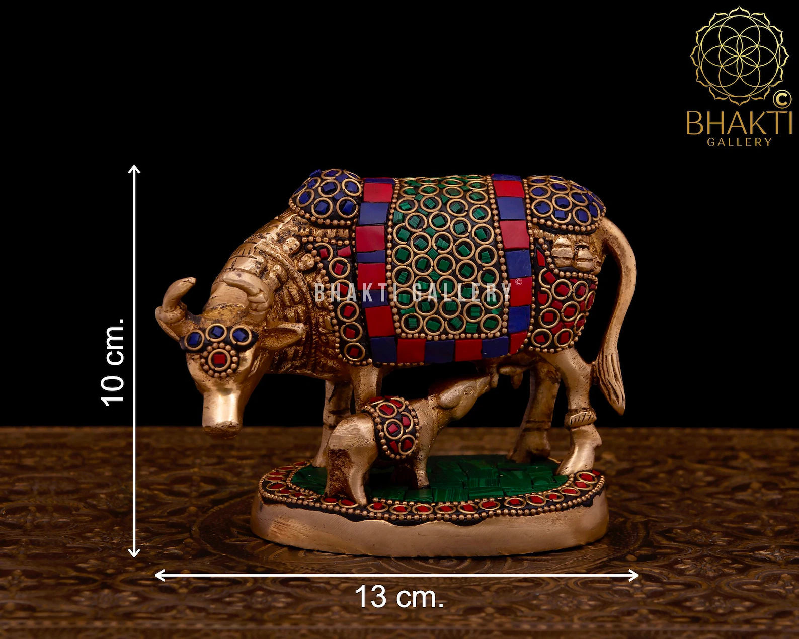 This 13 cm small-size brass Kamadhenu cow and calf idol is ideal for home mandir, office décor, Vastu correction, housewarming ceremonies, festive occasions, and spiritual gifting. Its compact size makes it perfect for placement on shelves, altars, desks, or display units.