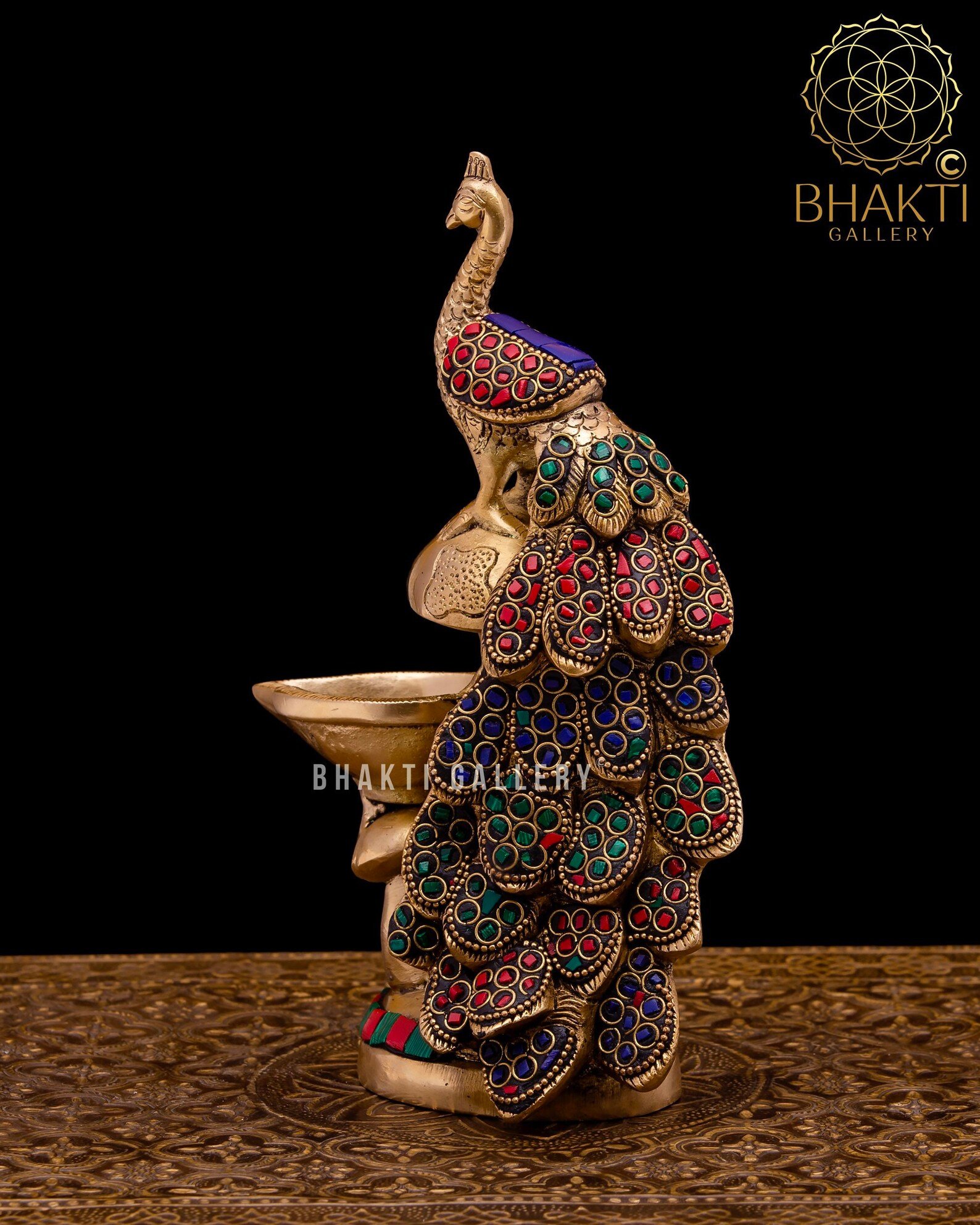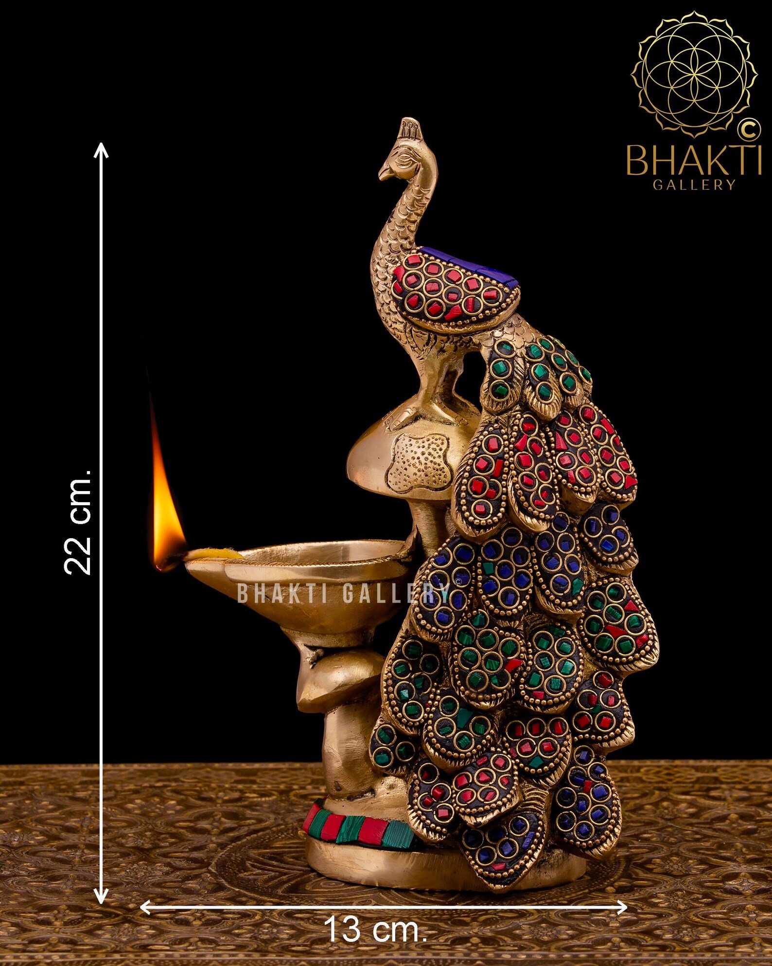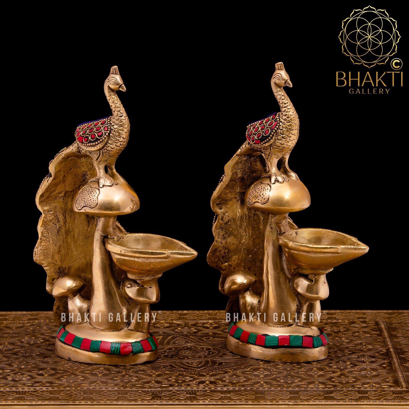 Home / Diya/ Oil Lamp/ Sankh / Brass Peacock Diya with Stonework – 22 cm Decorative Brass Oil Lamp Stand (Set of 2)