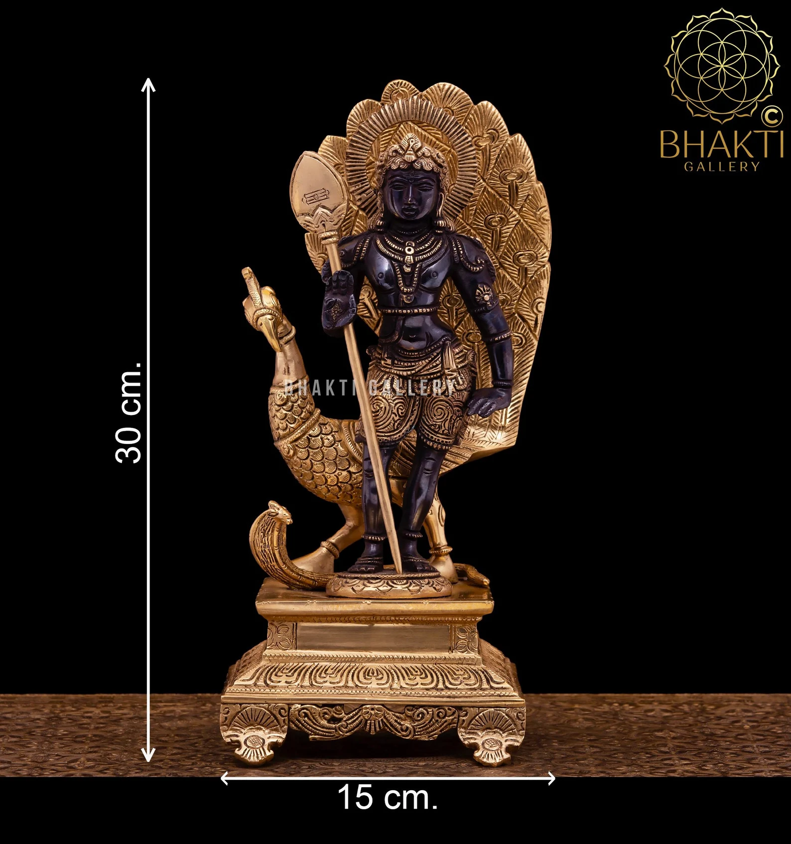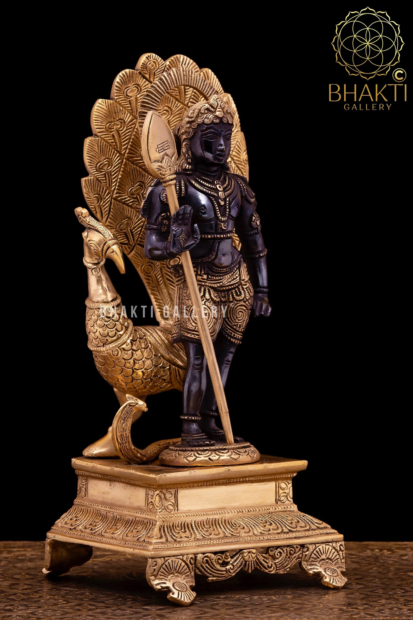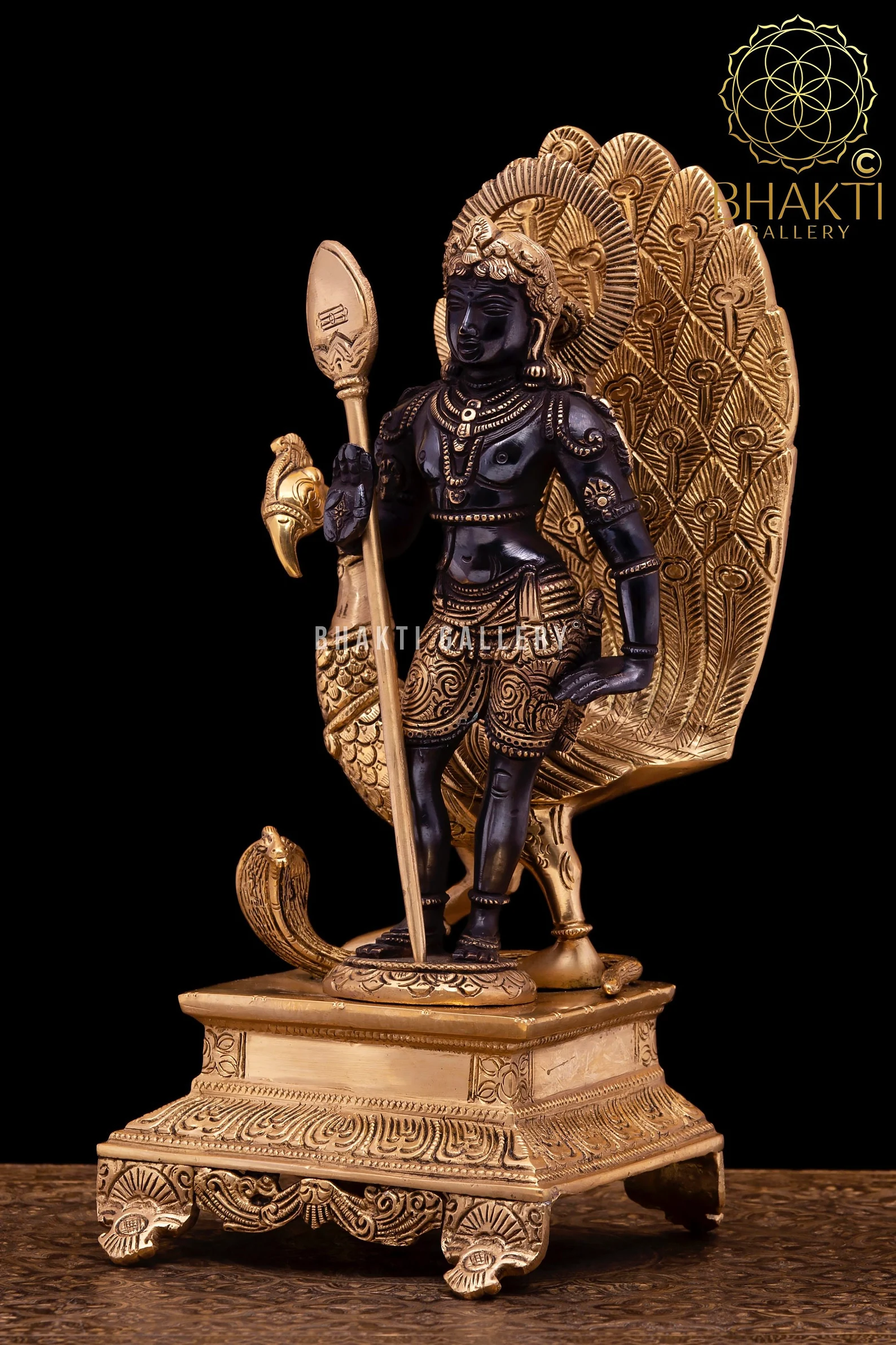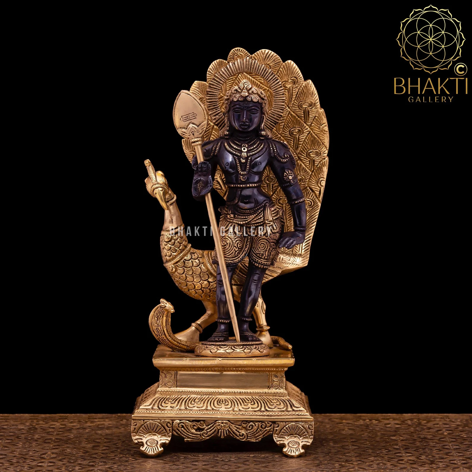 This magnificent Brass Lord Murugan (Kartikeya) Statue with Peacock showcases the divine warrior god in a striking golden-black finish, symbolizing courage, protection, wisdom, and victory over evil. Lord Murugan, the son of Lord Shiva and Goddess Parvati, is revered as the commander of the celestial army and a powerful protector deity.
