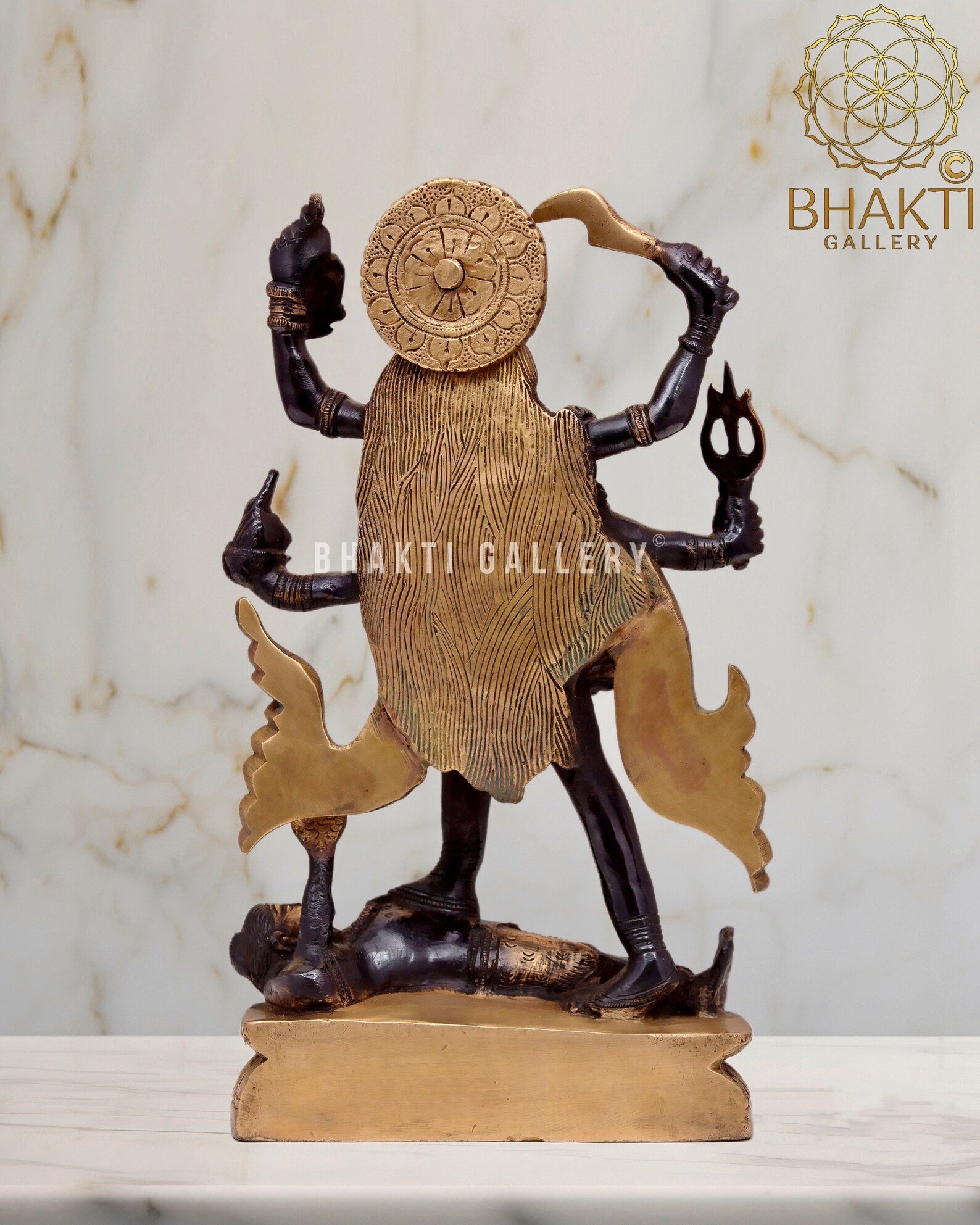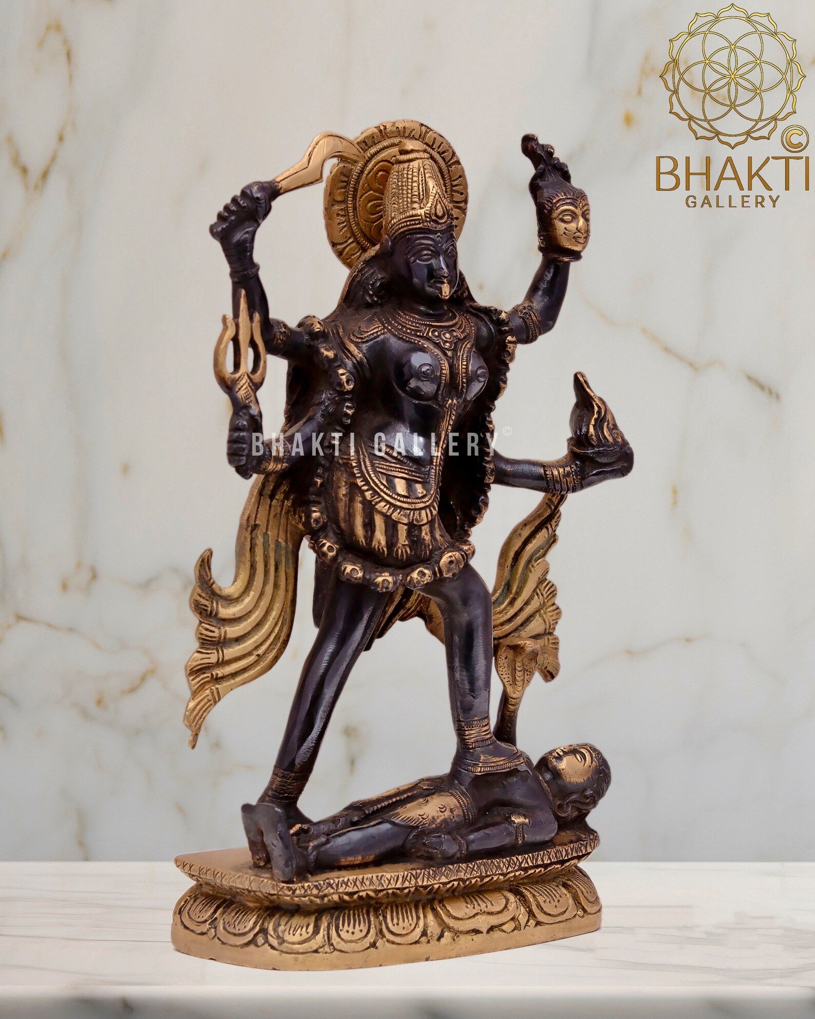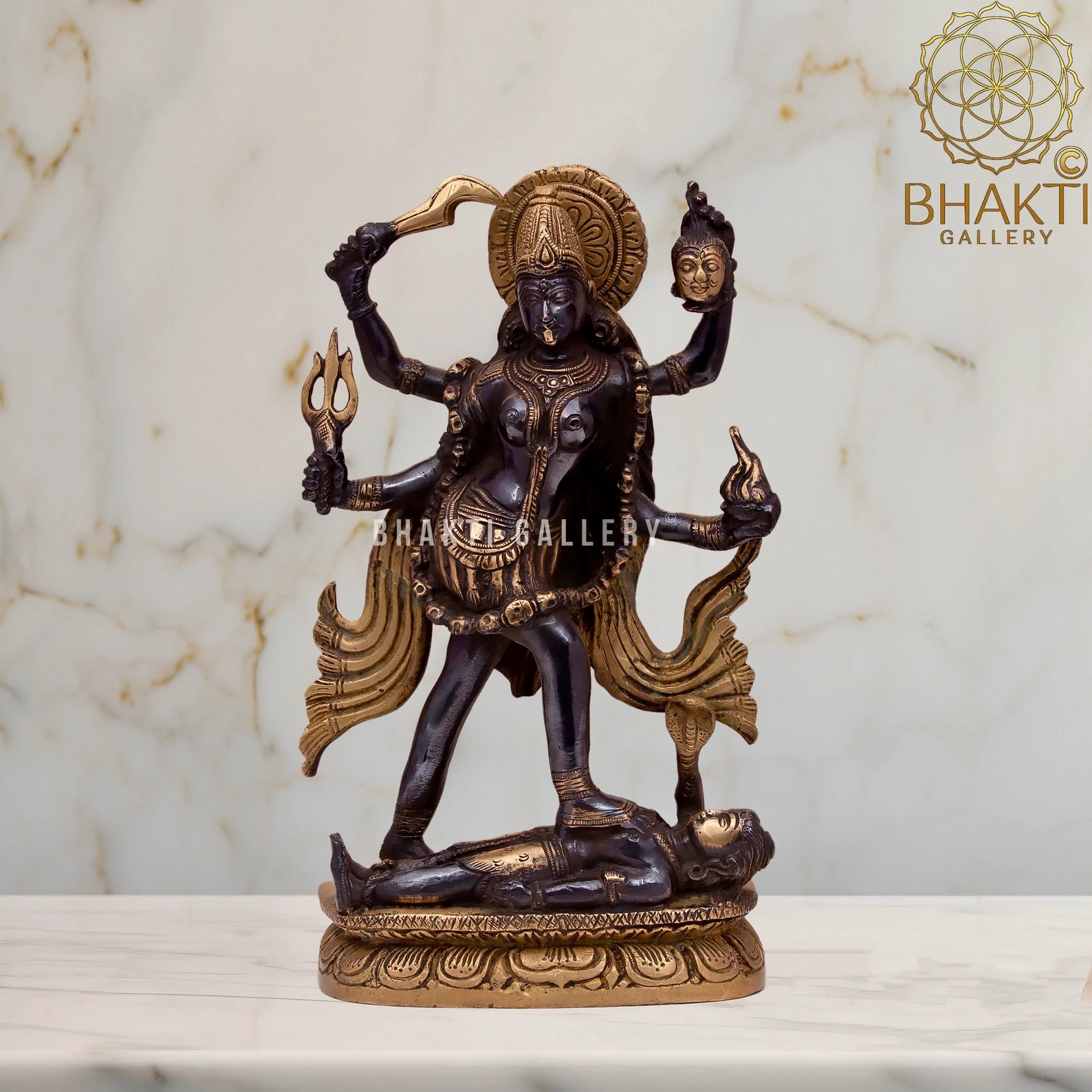 This big brass Goddess Kali statue with striking black and golden finish beautifully captures her immense power, protection, and transformative energy. Ideal for pooja rooms, temples, meditation spaces, and spiritual décor, this idol holds special significance during Kali Puja and Navratri, and for devotees seeking strength, courage, and divine protection.