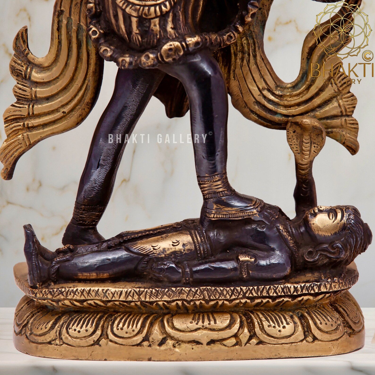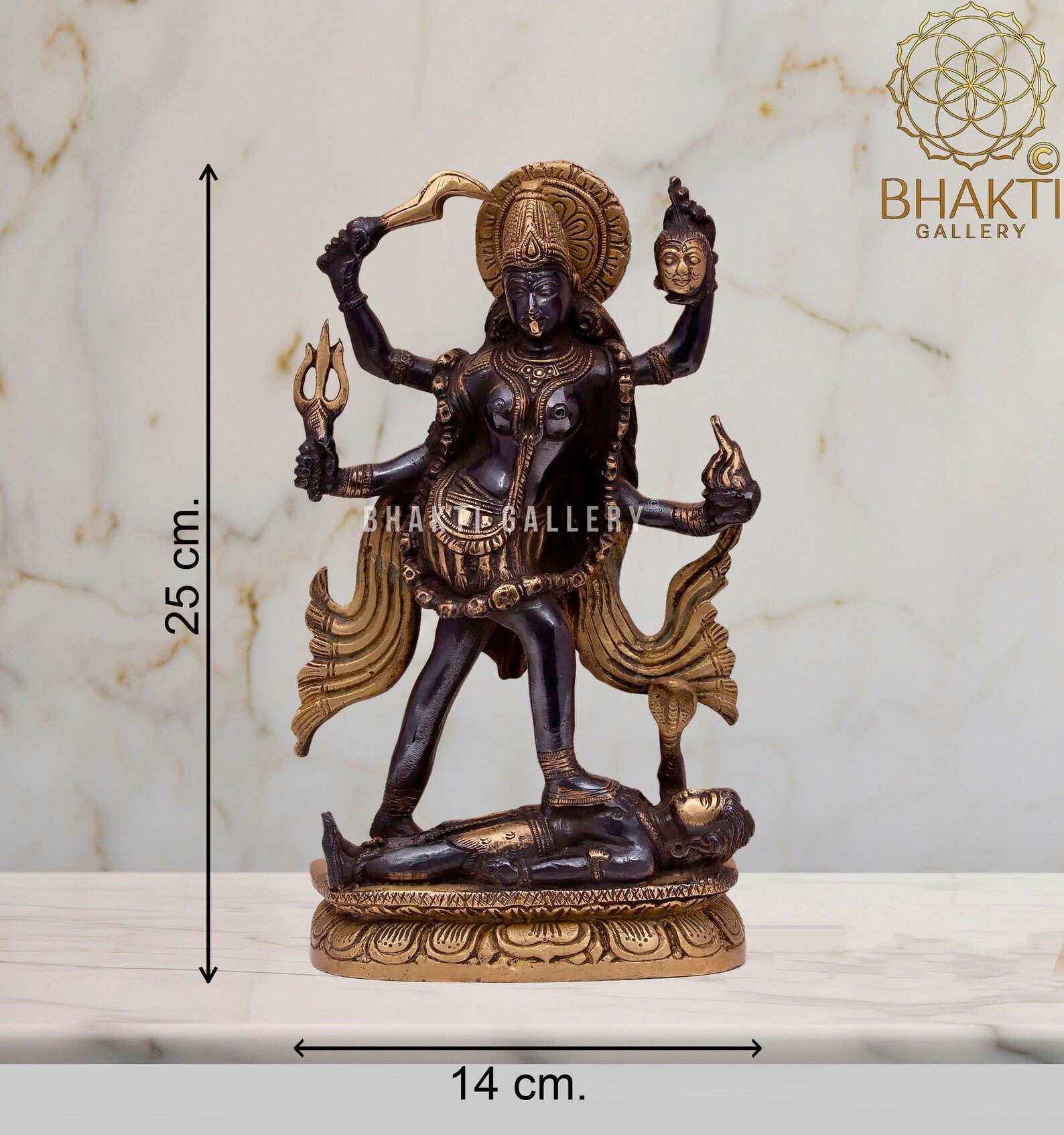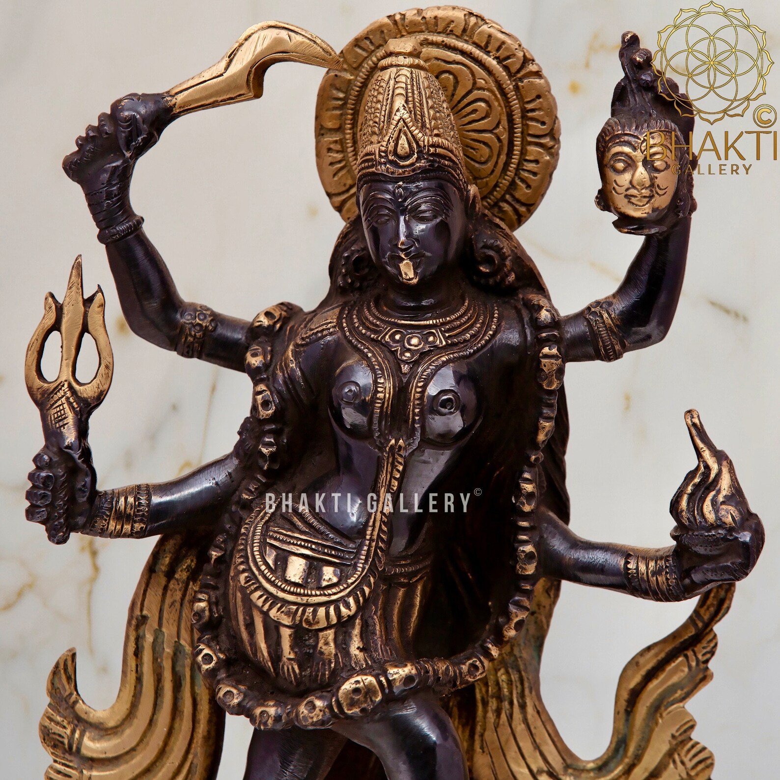 This big brass Goddess Kali statue with striking black and golden finish beautifully captures her immense power, protection, and transformative energy. Ideal for pooja rooms, temples, meditation spaces, and spiritual décor, this idol holds special significance during Kali Puja and Navratri, and for devotees seeking strength, courage, and divine protection.