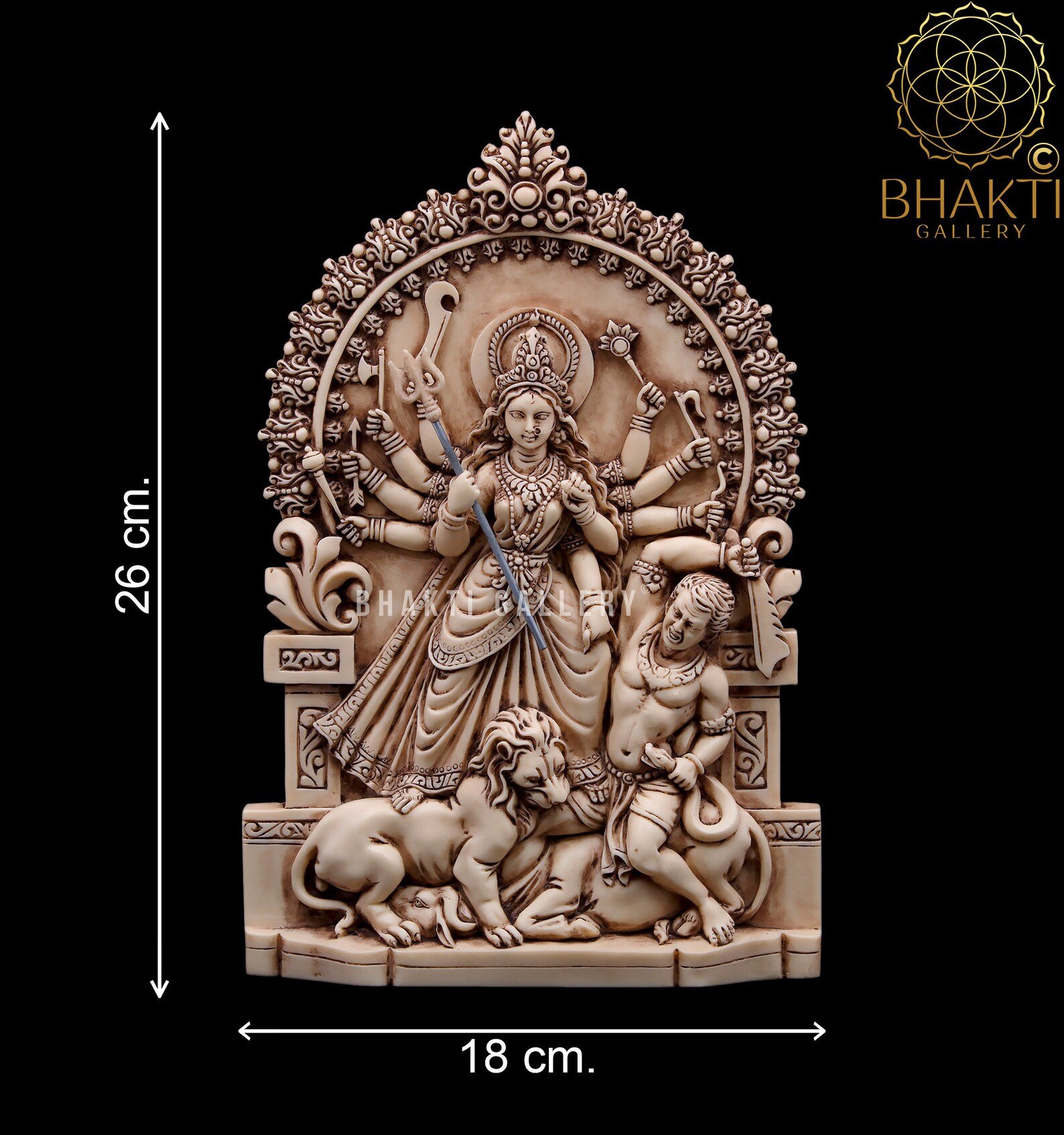 Celebrate the triumph of good over evil with this 26 cm Maa Durga Mahishasuramardini statue crafted in elegant ivory-finish dust marble. Depicting the goddess slaying Mahishasura while seated on her lion, this powerful idol is ideal for home temples, Durga Puja, Navratri worship, and spiritual décor.