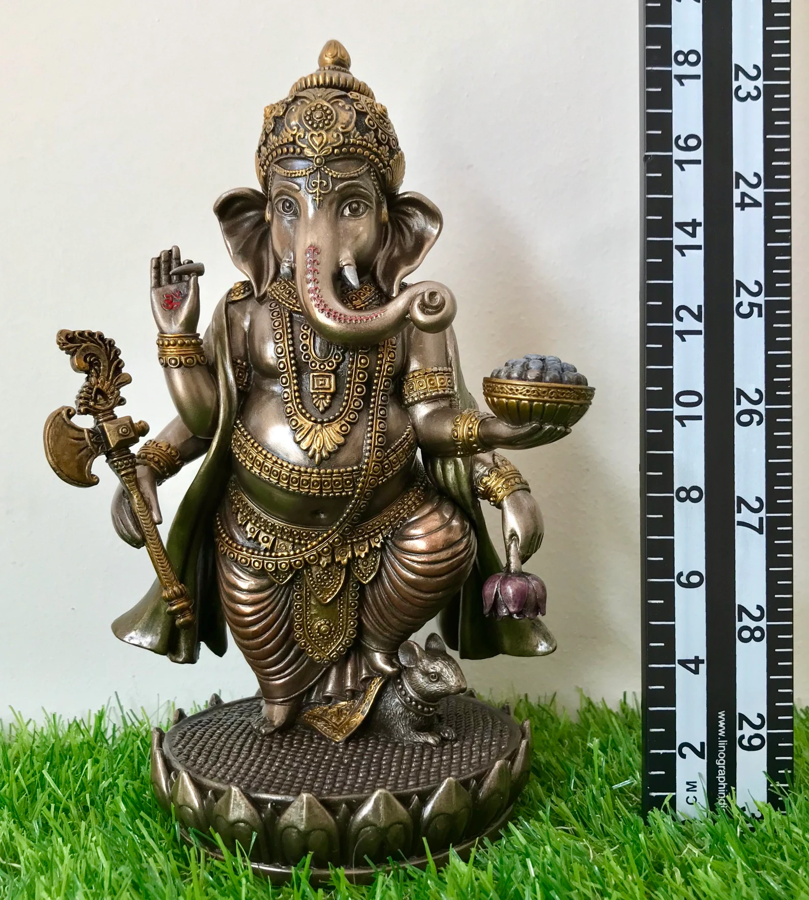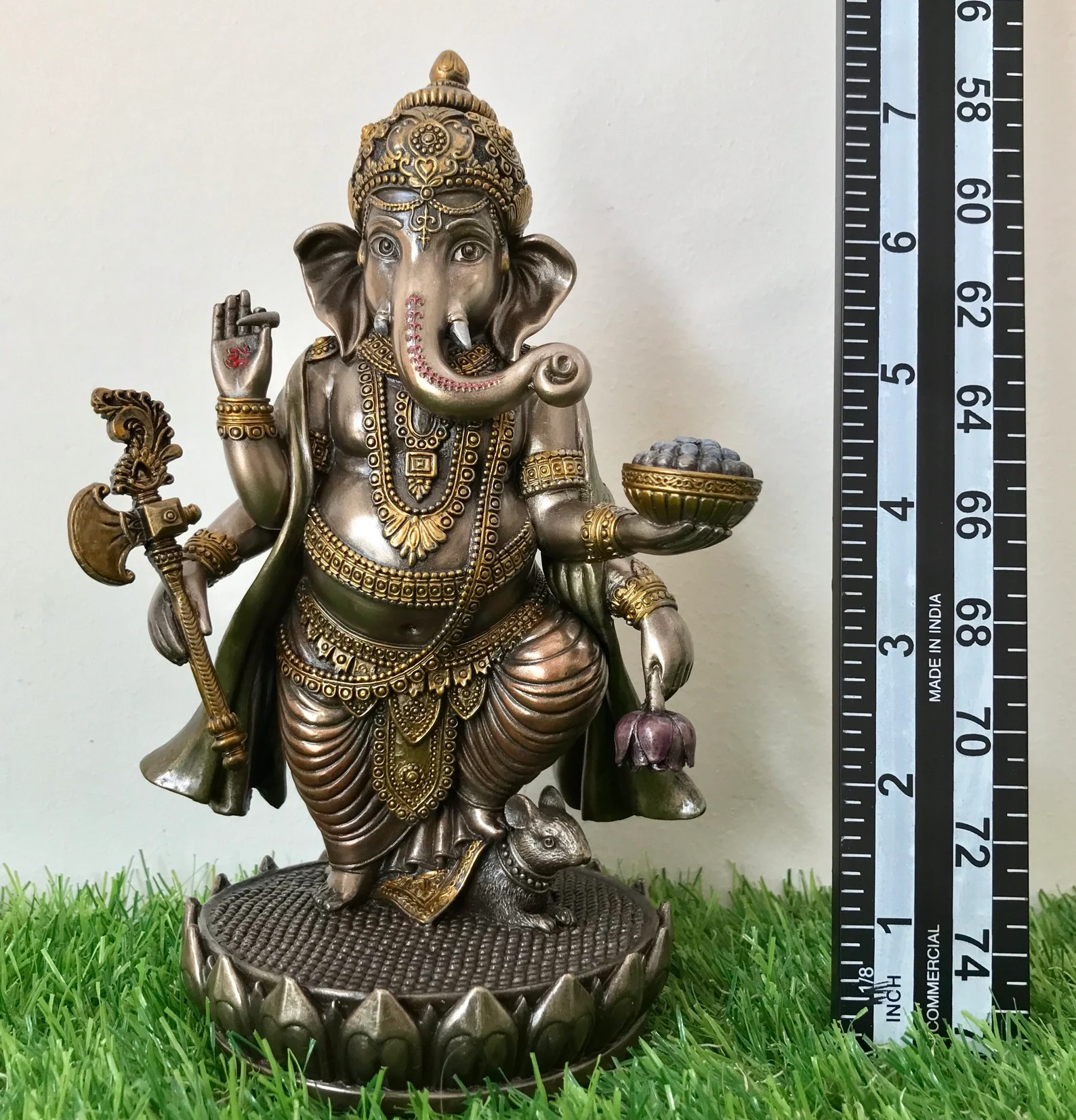 A finely detailed 19 cm standing Lord Ganesha statue crafted in bonded bronze, symbolizing wisdom, prosperity, and readiness for new beginnings. Ideal for home altars, meditation spaces, offices, and auspicious gifting.