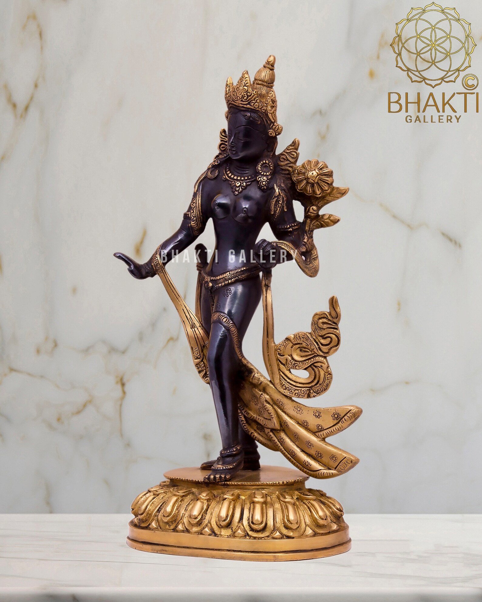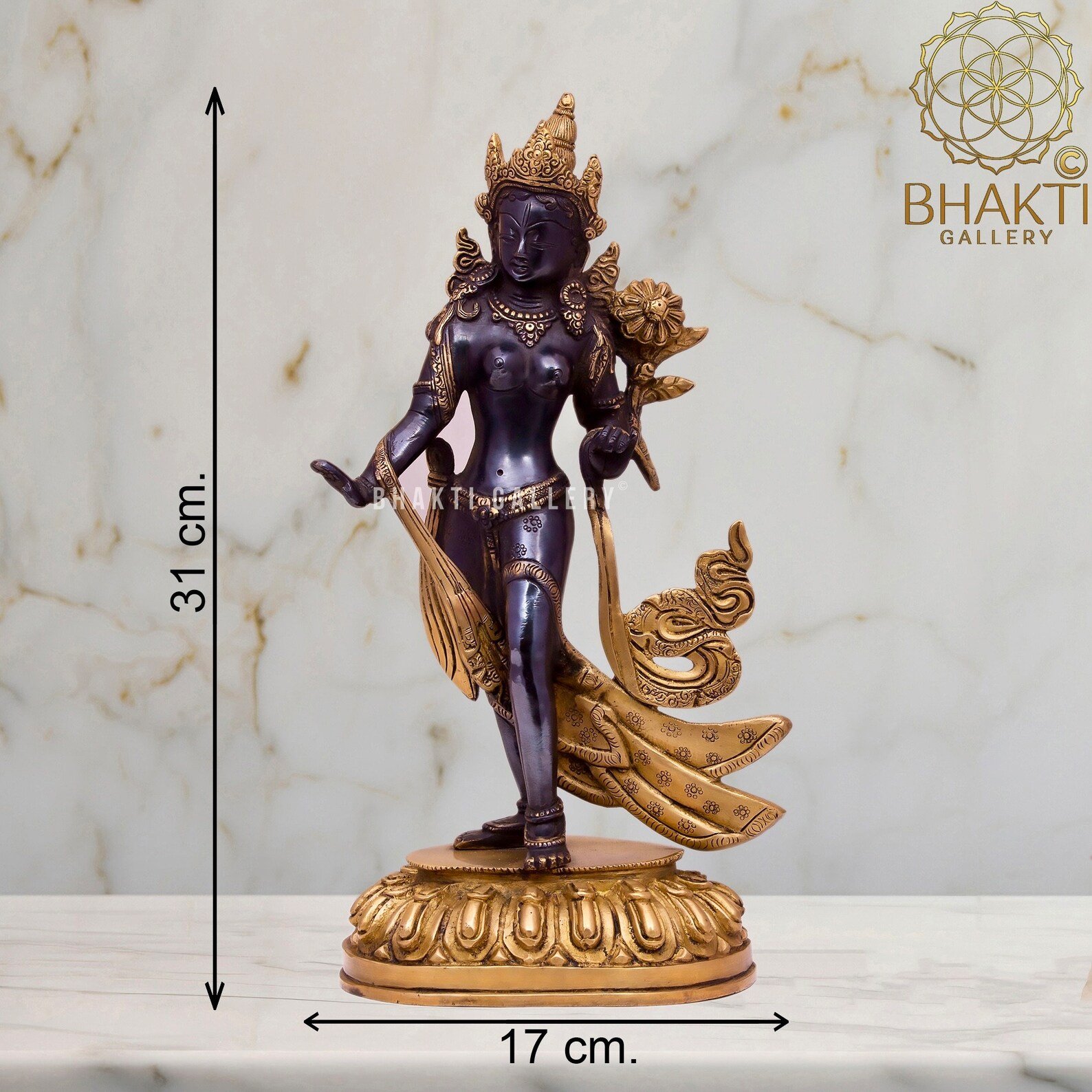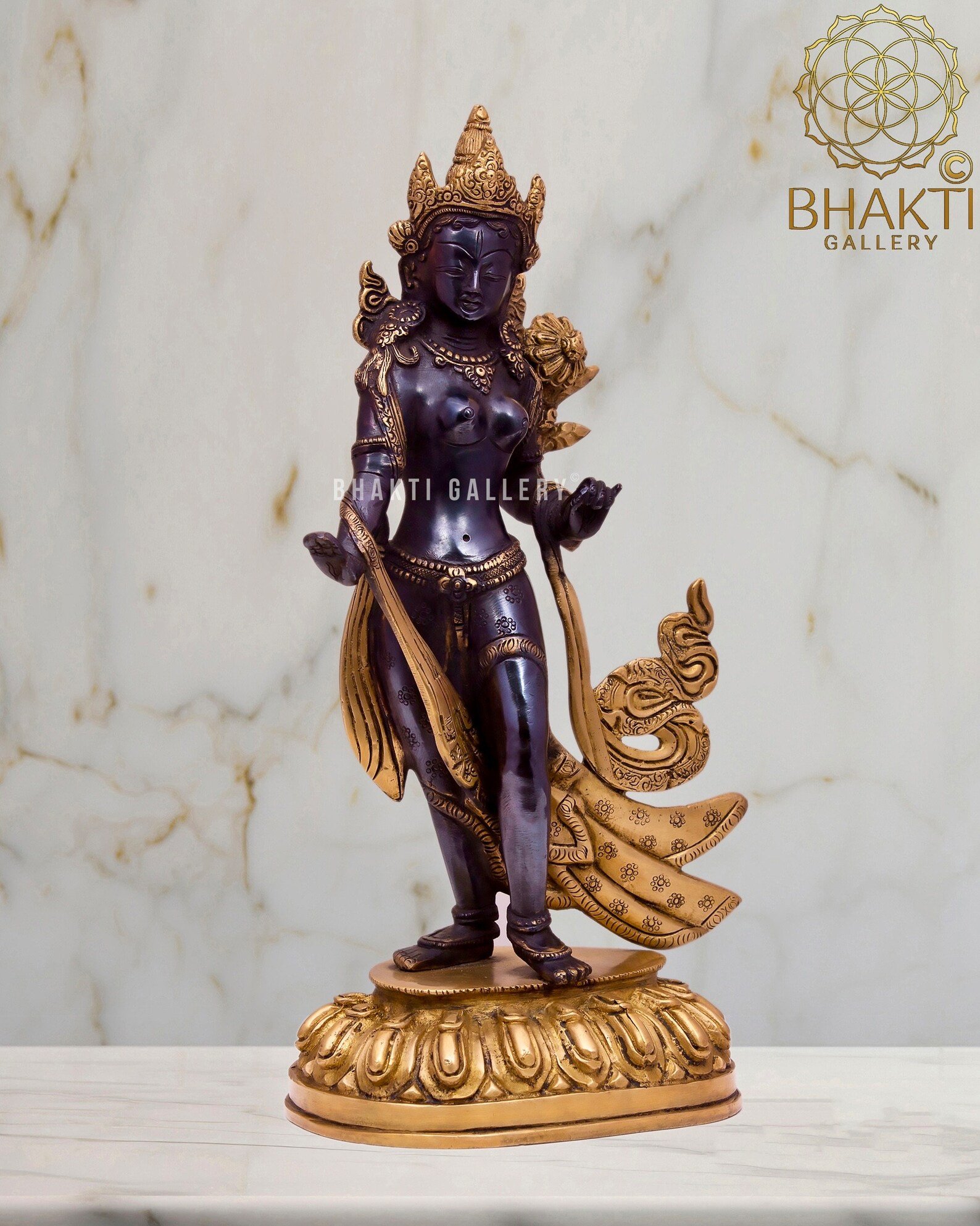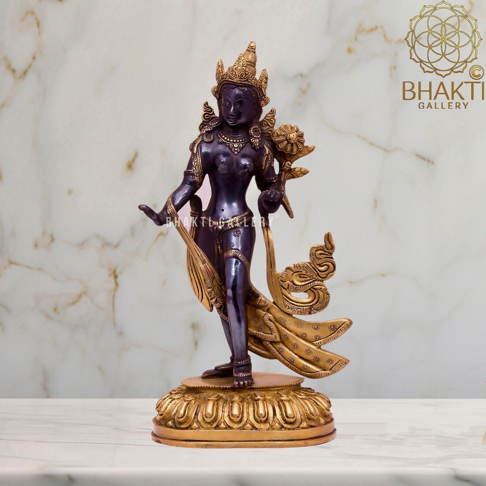 Invoke divine protection, compassion, and feminine spiritual power with this beautifully crafted Standing Tara statue, made in solid brass with an elegant black and golden finish. Goddess Tara is one of the most revered female deities in Tibetan Buddhism, honored as a Bodhisattva, savior, and embodiment of Female Shakti who responds swiftly to the suffering of all beings.