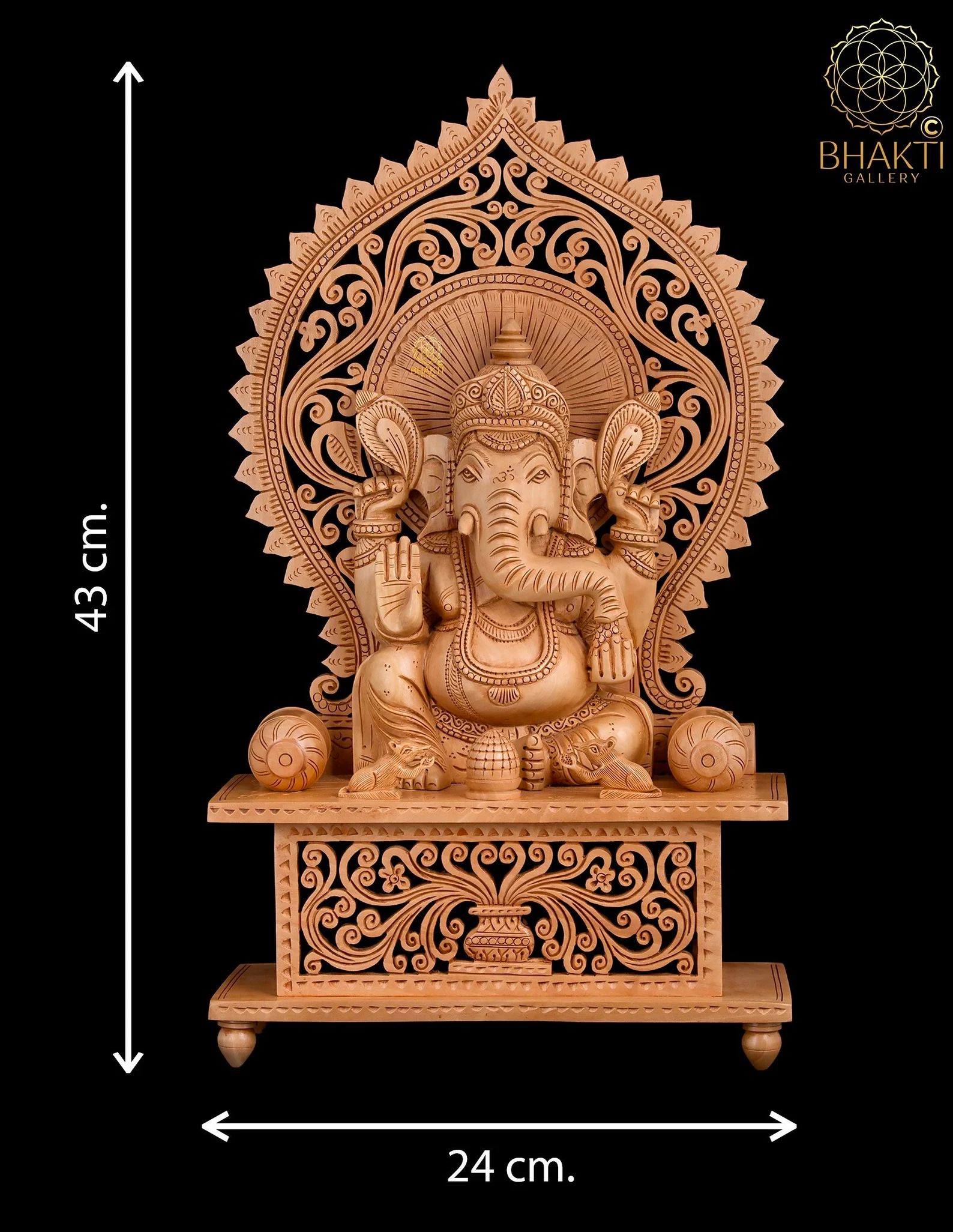 This Large Hand-Carved Wooden Ganesha Statue (43 cm) is a beautifully crafted representation of Lord Ganapathi in a serene sitting posture. Meticulously carved by skilled artisans, the statue highlights the natural grain and warmth of wood, blending spiritual depth with refined craftsmanship.